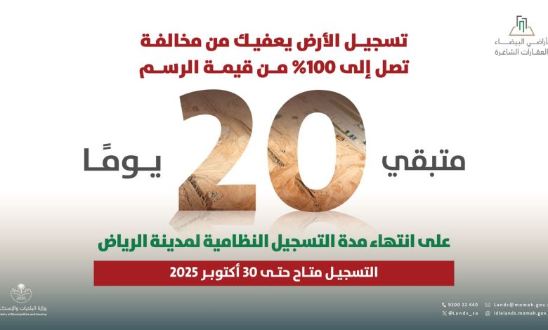 تم النشر في الجمعة 2025-10-10أكد برنامج الأراضي البيضاء والعقارات الشاغرة أن المتبقي 20 يومًا فقط على نهاية فترة التسجيل النظامية للأراضي الواقعة داخل النطاق العمراني بمدينة الرياض، والتي تنتهي بتاريخ 30 أكتوبر 2025، موضحًا أن النظام سيبدأ عند انتهاء المهلة برصد المتخلفين عن التسجيل والتقدم بالوثائق المطلوبة آليًا؛ وذلك تمهيدًا لإيقاع الغرامات المترتبة على هذه المخالفات وفق أحكام النظام ولائحته التنفيذية.